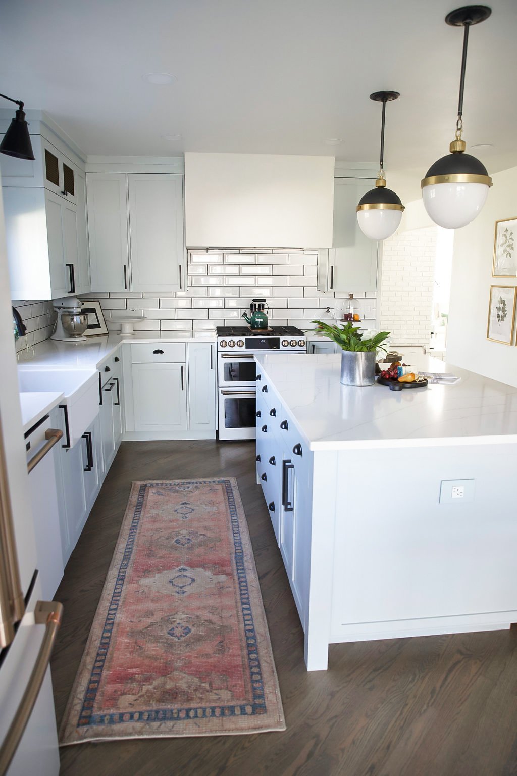 I had been eyeing the GE Cafe White appliances with gold hardware and couldn’t wait to use them for my own home. I like that GE offers upgrades to their ranges with their app and after we received our range, we got an upgrade to do air frying in our lower oven! I usually like to implement double ovens into my kitchen designs but where space is limited this was a great solution! I love the look of white marble so these quartz countertops were a win! We used them on the perimeter and the island for a seamless look. We also made a custom plaster hood to go over the range! It’s not always as easy as it looks to pull off custom items but he did a great job. I really wanted a functional organized kitchen so I added spaces like a baking center, spice drawer, utensil pull out, baking sheets divider, and hidden double trash pull out. My hubby also completed the subway backsplash complete with contrasting grout to add a little dimension. Again, he did a fabulous job! I accessorized with some of my favorite pieces from Blanc Noir shop and wha la… it’s done!